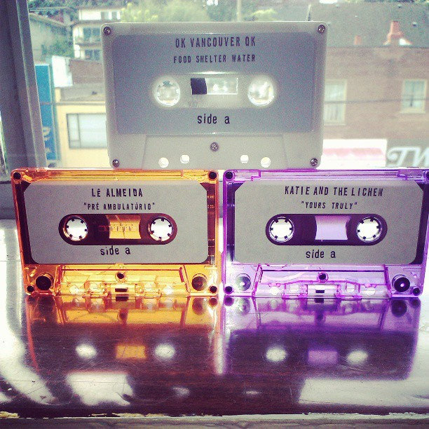 White cassette tape with pale blue, hand stamped labels. Limited to 100 copies. Third edition. Stand in Vancouver, BC on a sunny day and hold this tape up to the sky, it will be camouflaged.